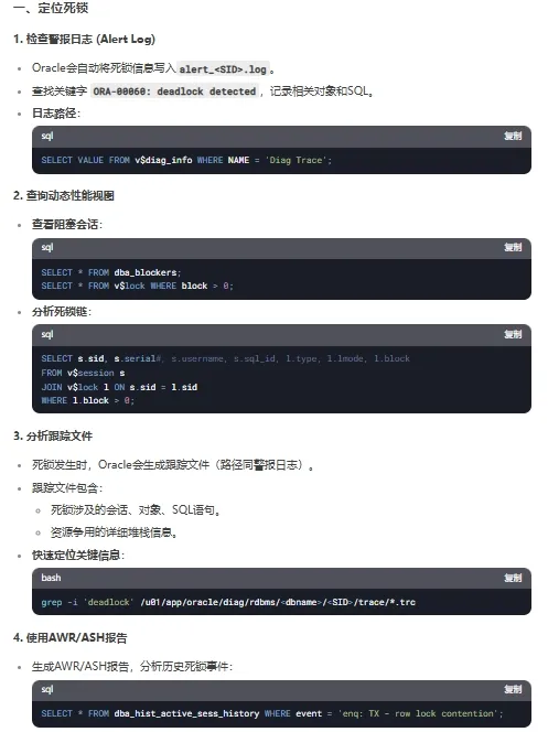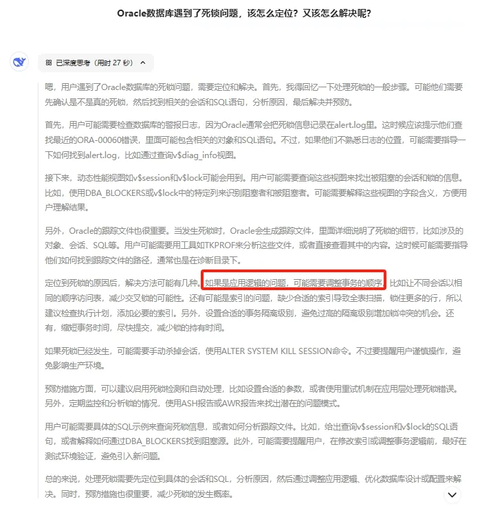 不得不说,DeepSeek 确实靠谱,亿华云我们看下 DeepSeek 给出的定位死锁的方法,基本上根据日志、跟踪文件来判断。