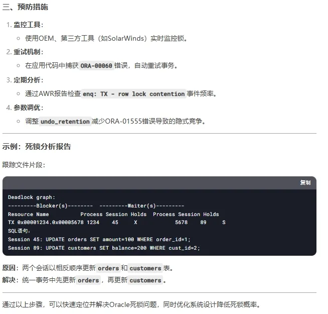 下面,再看一下 DeepSeek 给出的预防措施和死锁分析报告示例。