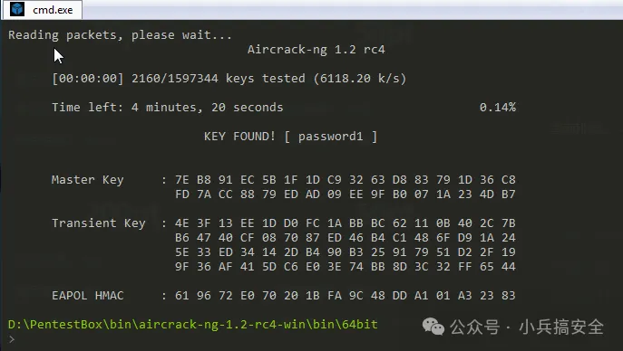 在wireshark中奖ctf.pcap包另存为ctf.cap,在aircrack-ng -w password.txt ctf.cap进行破解,获取密码为password1,如图2所示。