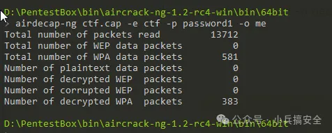 执行命令airdecap-ng ctf.pcap -e ctf -p password1 -o me.cap,对ctf.pcap包进行解密,其中ctf为AP名称,password1为密码,生成me.cap包,如图3所示。