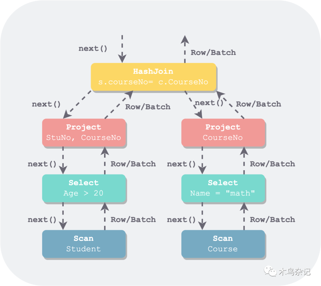 传统的执行引擎多使用火山模型,一种属于拉( pull-based )流派的执行方式。其基本概念就是以树形的方式组织算子,并从根节点开始,自上而下的进行递归调用,算子间自下而上的以行(row)或者批(batch)的粒度返回数据。