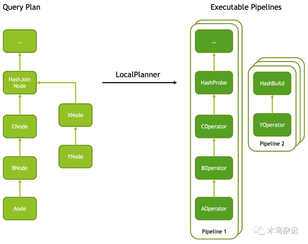 近些年来,基于推(push-based)的流派渐渐火起来了,DuckDB、Velox 都属于此流派。类似于将递归转化为迭代,自下而上,从叶子节点进行计算,然后推给父亲节点,直到根节点。每个算子树都可以拆解为多个可以并行执行的算子流水线(下图源,Facebook Velox 文档[8])
