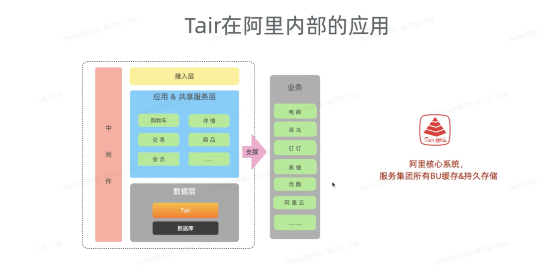 现在在阿里集团内部,绝大部分BU的核心在线业务都使用了Tair,包括最开始淘宝、天猫电商的交易导购广告,到菜鸟的电子面单物流送货轨迹,再到钉钉消息的推送、优酷的视频播放列表等,这些在线业务都是用了Tair。