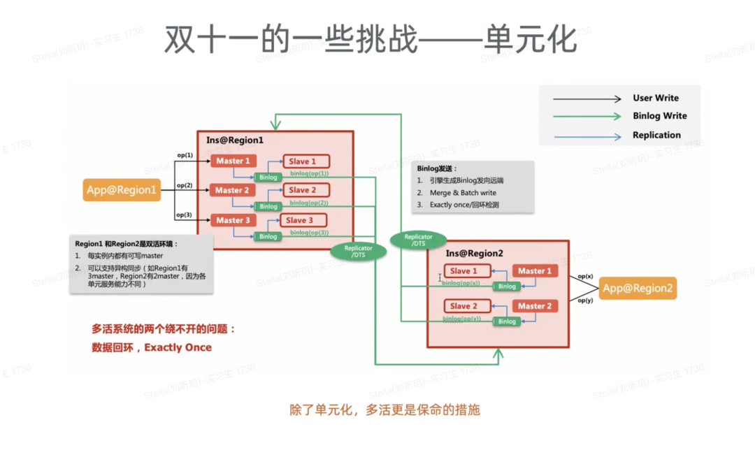全球多活如今的一些客户,特别是中大型的客户,他希望在多个地域做多活。所以我们今天是可以做到三地域多活的同步。它的原理是通过 Binlog 来做 3地的多活。我们更建议应用在做多活的时候,能够在应用层面按 key 分布到多个单元,这样会更容易避免冲突。