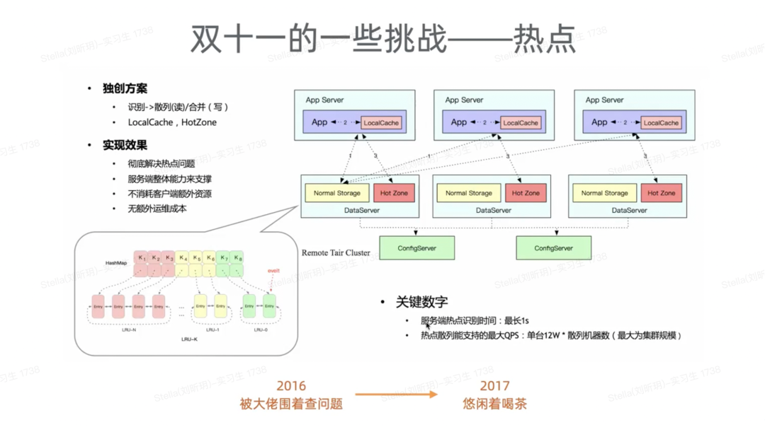 2016年双十一的一个小插曲,我们Tair的一台机器流量特别大,最高大概到了70%+左右,该服务器的 QPS 在当时几十万次每秒,但是value size特别大。当时一看就是一个火热的手机商品,也是那几年双十一最热的商品项之一,它的访问量最大,而流量都到了一台服务器上。当时平稳度过了,如果访问量再大一点,流量再大一点,那可能服务器流量真会跑到一个非常高的水位,对稳定性产生影响。