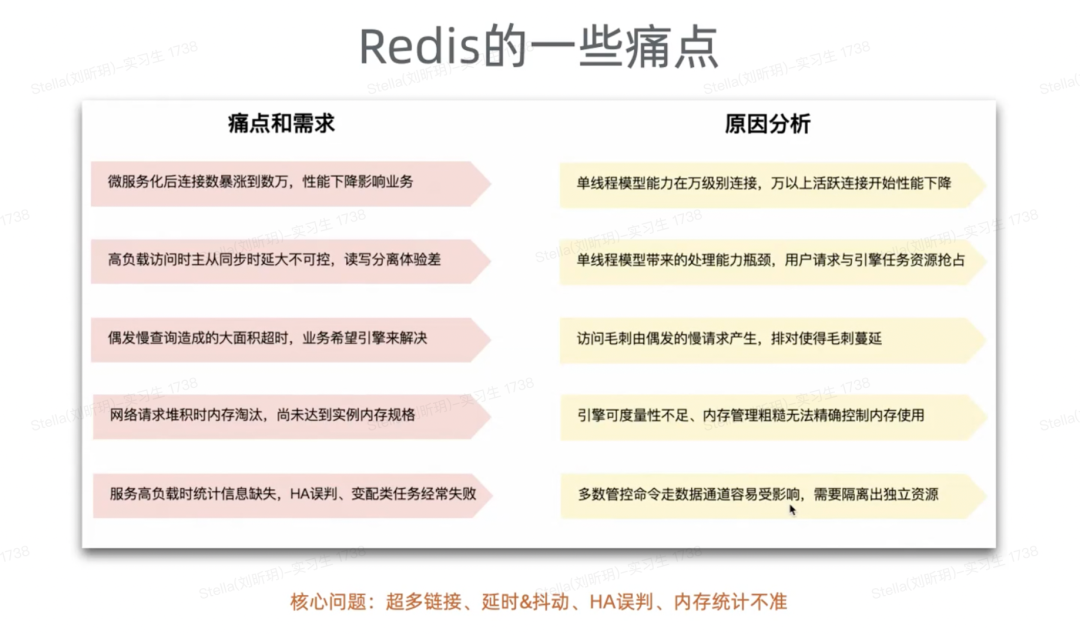 接下来我们看看第4部分,这部分其实是讲前面支撑我们 Tair 产品形态的关键能力,就包括跟开源的 Redis 的核心区别是什么、关键技术点是什么?先看看客户用 Redis 的一些痛点。