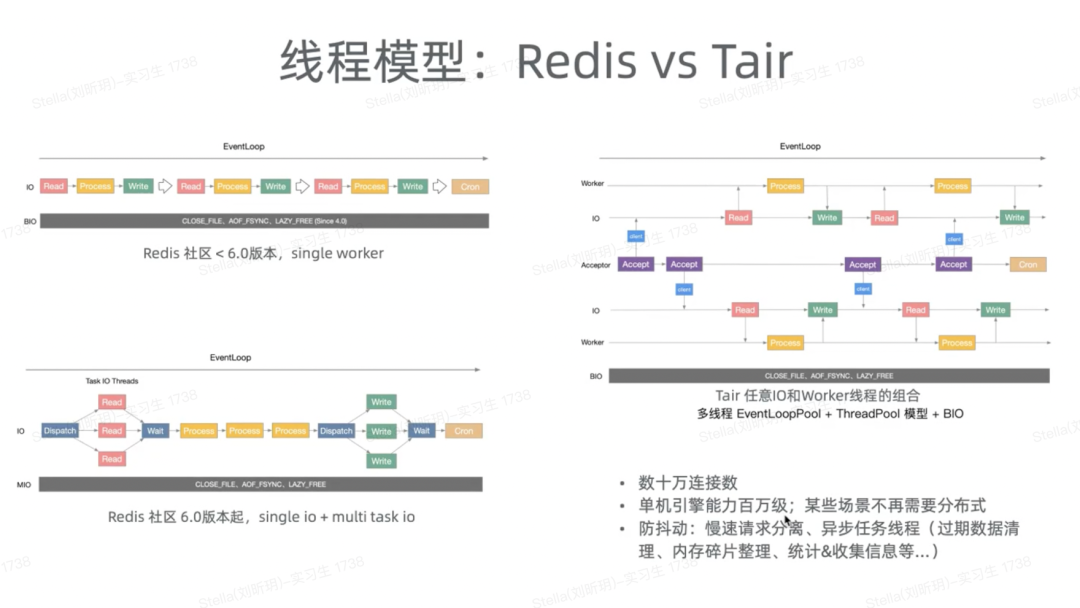 对于Tair来说,我们脱离Redis,从头自研,我们把网络接收线程跟工作处理线程独立开了,都可以用 N x M 的方式灵活地去配;这样 Tair 就可以处理数十万的活跃的连接数,因为网络线程足够多,单机的处理引擎可以提升得足够高,甚至可以跑到百万级。