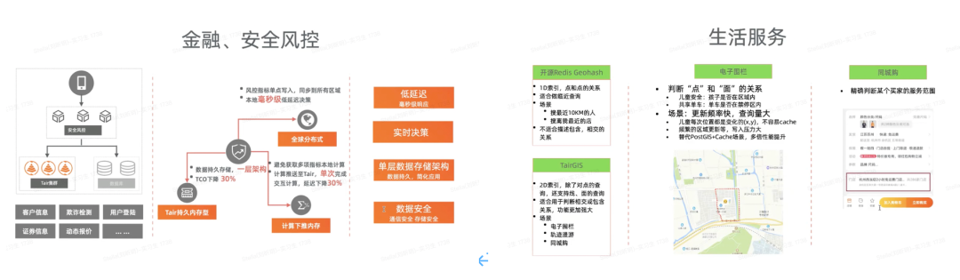 金融、安全风控方面:在金融、安全风控方面,Tair里面做了一些计算的算值,可以在某一个时间段里面譬如购买商品的数量,这一类的计算来做防黄牛反作弊。