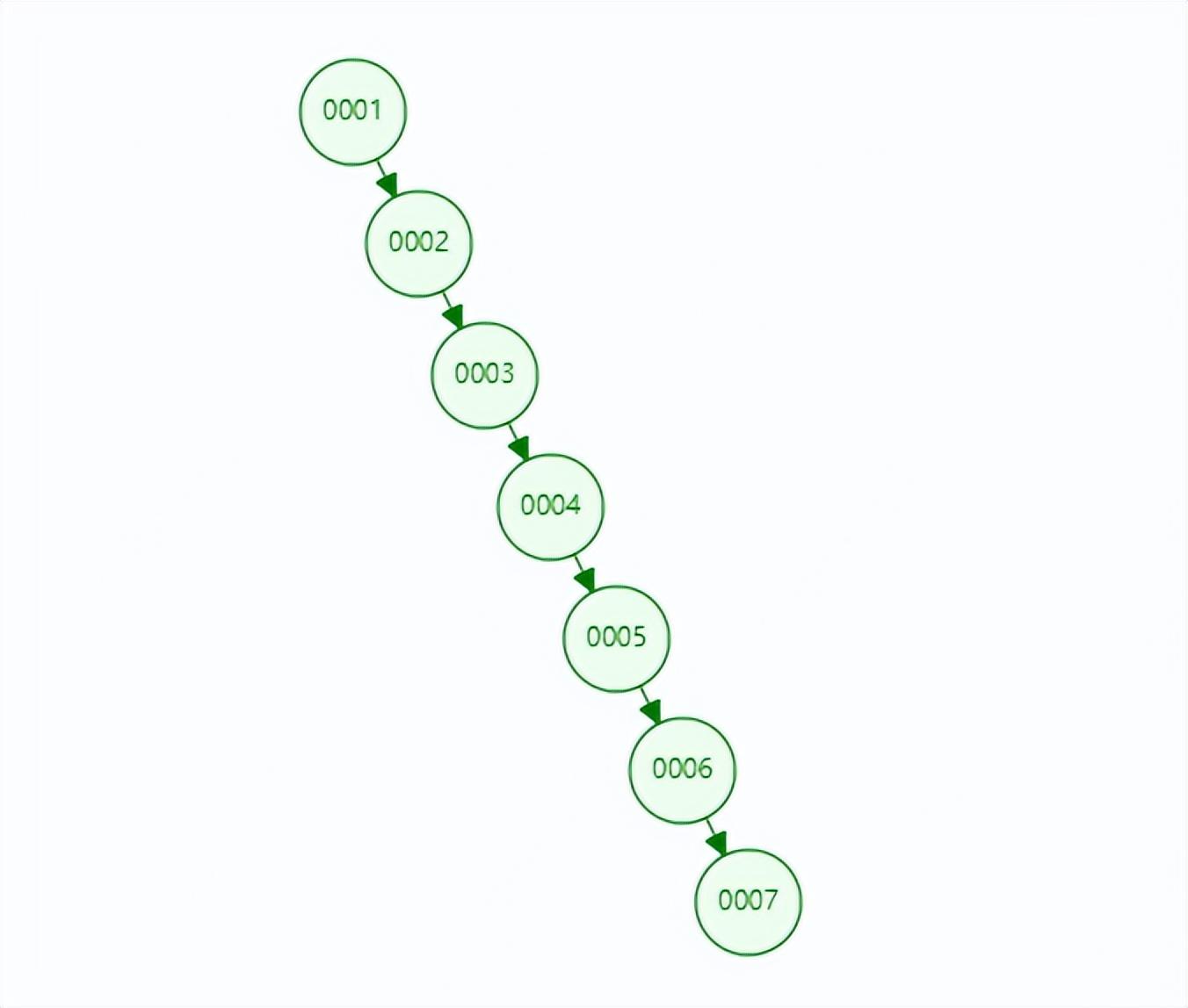 但如果是一个按照顺序递增的值,例如为col1建立索引,不再适合使用二叉树建立索引,因为此时使用二叉树建立索引将会变成一个链式索引,此时的索引结构如下图所示,如果查找6节点需要6次遍历才能找到。