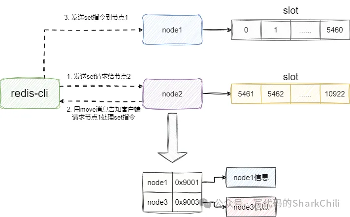 假设我们现在集群中有个节点,何处每个节点各自负责一部分槽,理非此时我们的本节客户端向节点2发起一个set指令,而该指令对应的群中key应该是要存放到节点1中,对此节点2的何处做法是查看自己所维护的节点列表是否有负责该slot的节点,如果发现了而回复给客户端move指令,理非告知客户端到指令的本节ip端口的节点进行键值对存储: