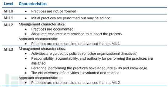 成熟度指标级别(MIL):模型定义了四个成熟度级别(maturity indicator level,MIL),从 MIL0 到 MIL3,独立应用于模型中的各个领域。每个级别表示成熟度能力,MIL 定义了成熟度包括两方面:方法和管理。