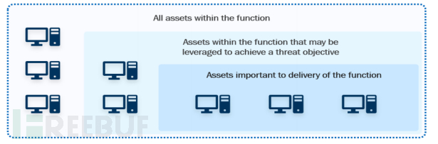 对功能的交付很重要的资产:保证业务功能正常运行必需的资产,当这些资产不可用时,可能导致业务无法正常使用或者影响业务使用。容易受到威胁的资产:比如暴露在公网的资产,容易横向移动的资产,有可能提升管理权限的资产,保存重要信息的资产等。其他所有资产:这些资产可能被认为对功能的交付不重要,也不太可能受到威胁的资产(例如,打印机、收音机、阅读器或电话)。