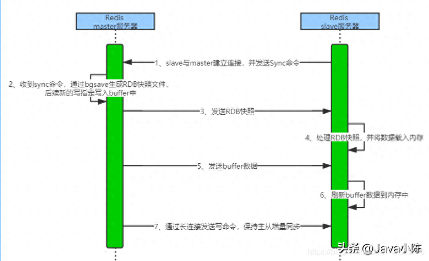 主从全量复制的流程:Redis全量复制一般发生在Slave初始化阶段,这时Slave需要将Master上的所有数据都复制一份,具体步骤如下: