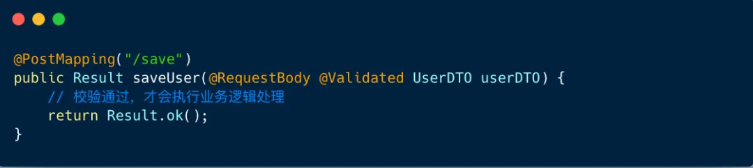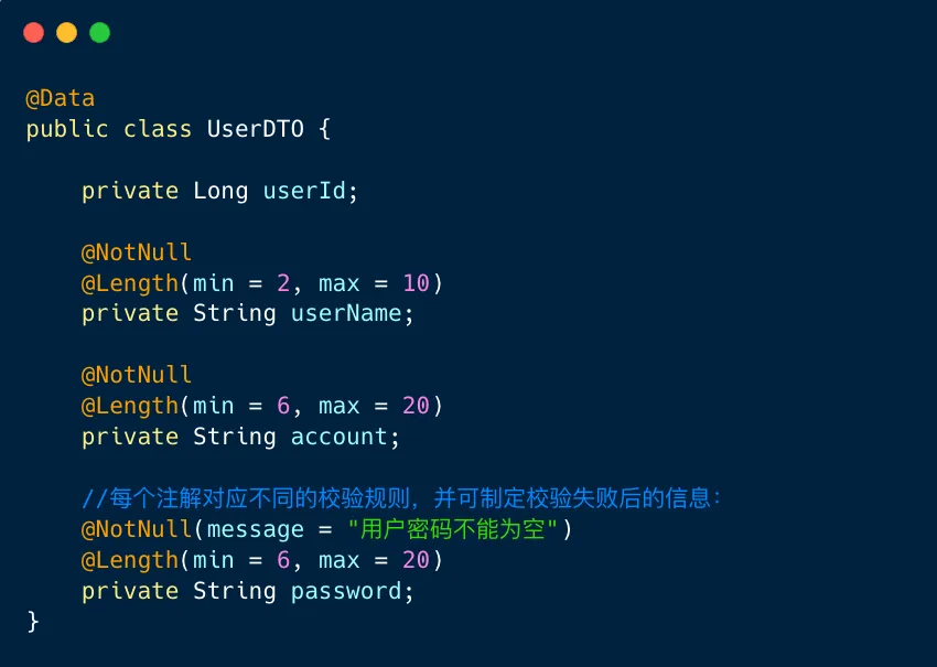 只要给 DTO 对象加上 @Validated 注解就能实现自动参数校验。比如,有一个保存 User 的接口,要求 userName 长度是 2-10,account 和 password 字段长度