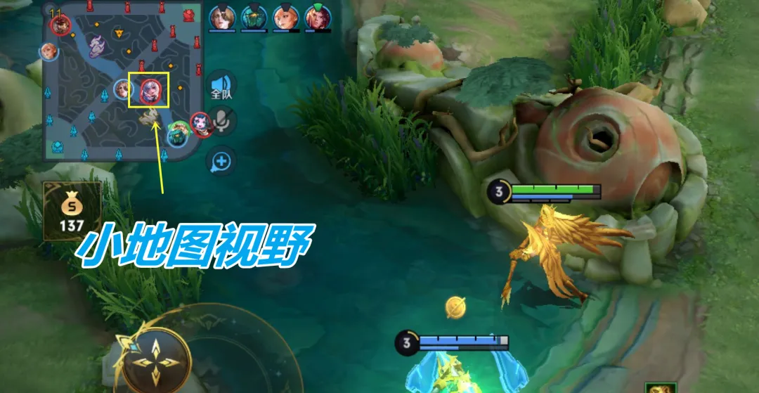 上图,后裔跟墨子在压对面马可蔡文姬,看到小地图中路铠跟小乔的视野,方向是往下路来的,这时候我们就得到了一个信息。