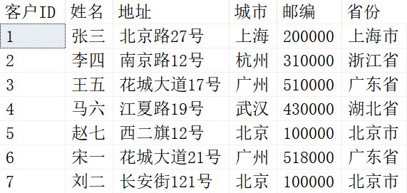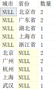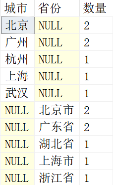 复制SELECT 城市, 省份, COUNT(客户ID) 数量 FROM Customers GROUP BY GROUPING SETS (城市,省份)1.2.3.4.5.6.结果如下