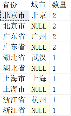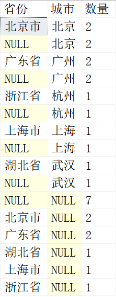 复制SELECT 省份, 城市, COUNT(客户ID) 数量 FROM Customers GROUP BY 省份,城市 WITH ROLLUP1.2.3.4.5.6.其结果为: