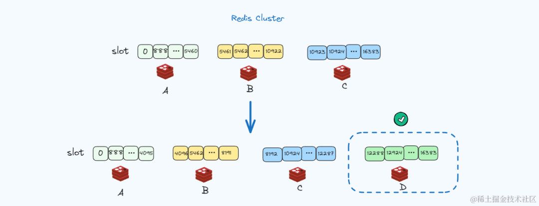 增加节点新增一个节点D,redis cluster的这种做法是从各个节点的前面各拿取一部分slot(槽)到D上,会变成这样: