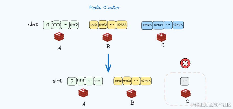 删除节点C之后,此时服务A、B节点中每个节点的槽位数是:18384 / 2 = 8192