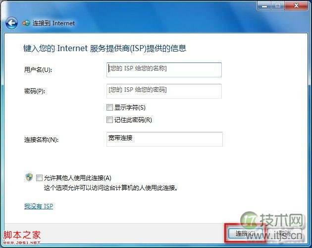 在之后出现的界面,输入相关ISP提供的信息后点击“连接”即可。