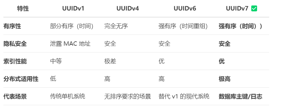 高精度时间前缀(48位):精确到毫秒的 Unix 时间戳,确保 ID 严格按时间递增(需 NTP 时钟同步)。尾部随机位(74位):保证分布式唯一性,避免 v1 的 MAC 地址泄露风险。有序性如何解决性能问题?