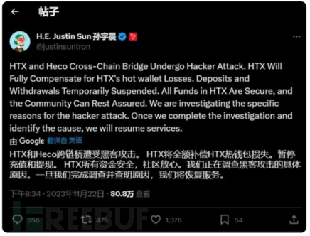 攻击事件发生后,HTX对此次黑客攻击事件作出多次回应。根据其官方公告,交易所承诺“全额赔偿此次攻击造成的损失,并100%保证用户资金的安全。作为预防措施,公司暂时停止了HTX平台和Heco链网关的充值和提现服务。