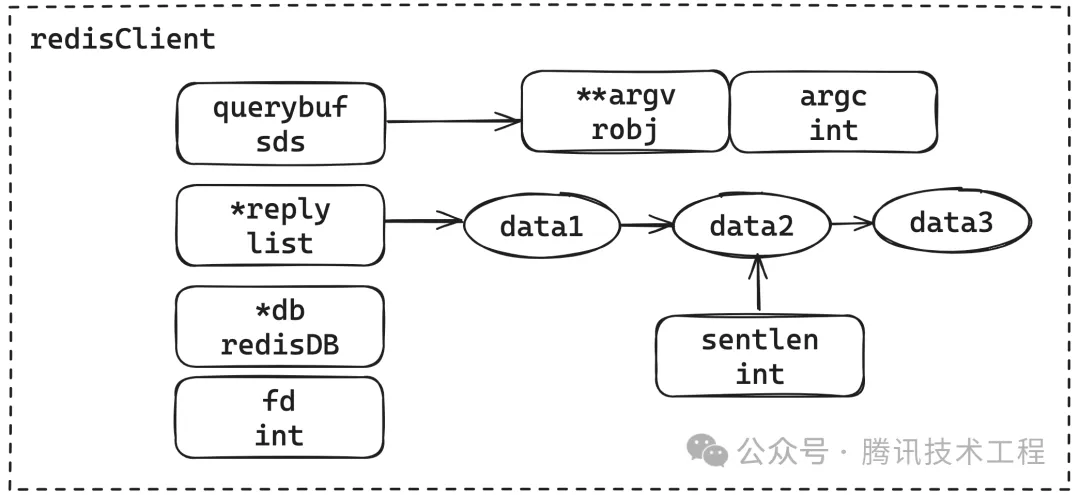 复制typedef struct redisClient { int fd; // 客户端发送命令和接收结果的socket文件句柄 redisDb *db; // 对应的db // 1-line sds querybuf; // 查询命令存储的缓冲区 robj **argv; // 查询命令转成的命令参数 int argc; // 参数个数 // 1-lines list *reply; // 命令执行完的回复的结果,是个列表 int sentlen; // 结果已经发送的长度 // 8-lines } redisClient;1.2.3.4.5.6.7.8.9.10.11.12.我们也用简单的示意图展示了redisClient的结构,它包含命令传输所使用的querybuf,命令在经过处理后会存放到argv中;然后比较重要的是*reply表示服务端给到客户端的回复的数据,这是个列表会在客户端写就绪的时候一个一个写回客户端,sentlen则是香港云服务器标识了传输的长度;然后就是对应的db与socket句柄fd。