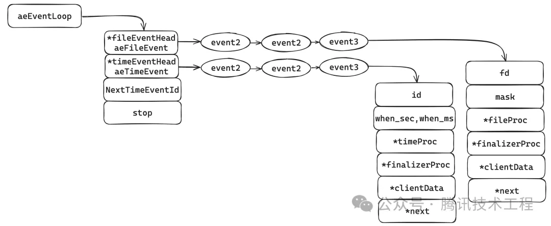 复制typedef struct redisObject { void *ptr; // 指向具体数据的指针 int refcount; // 引用计数 unsigned type:4; // 类型 unsigned notused:2; // 未使用,可能是为了扩展/占位 unsigned encoding:4; // 编码方式 unsigned lru:22; // 最近最少使用 } robj;1.2.3.4.5.6.7.8. 5. aeEventLoopaeEventloop是redis事件模型基础数据,它主要包含文件事件和时间事件的两个链表。对于文件事件来说,包含文件句柄fd,事件类型mask,对应处理函数fileProc;对于时间事件来说包含id、执行时间(when_sec、when_ms)和对应执行函数timeProc 对应的源代码如下: