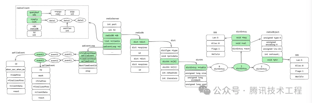 复制int main(int argc, char **argv) { initServerConfig(); // 初始化配置 // 8-lines 从文件中读取配置 initServer(); // 初始化服务 if (server.daemonize) daemonize(); // TODO redisLog(REDIS_NOTICE,"Server started, Redis version " REDIS_VERSION); // 5-lines,内存检查,加载rdb if (aeCreateFileEvent(server.el, server.fd, AE_READABLE, acceptHandler, NULL, NULL) == AE_ERR) oom("creating file event"); // 创建一个读的文件事件,处理者是acceptHandler redisLog(REDIS_NOTICE,"The server is now ready to accept connections on port %d", server.port); aeMain(server.el); // 启动redis主循环 aeDeleteEventLoop(server.el); // 主循环退出清理资源 return 0; }1.2.3.4.5.6.7.8.9.10.11.12.13.14.然后我们看看initServer做了什么初始化,鉴于本文是阐述基本原理,因此注释掉了非主链路上的代码,可以看到它初始化了客户端列表、事件循环、db、创建了时间事件,将这几个核心的组件初始化了