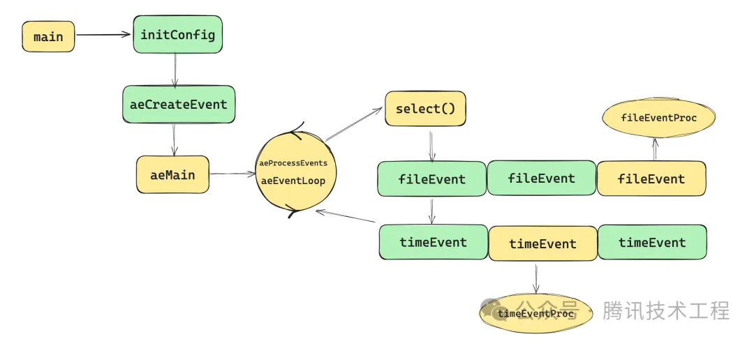复制static void initServer() { // 5-lines ... server.clients = listCreate(); // 初始化客户端列表 // 4-lines server.el = aeCreateEventLoop(); // 初始化事件循环 server.db = zmalloc(sizeof(redisDb)*server.dbnum); // 为db分配内存 // 3-lines ... server.fd = anetTcpServer(server.neterr, server.port, server.bindaddr); // 初始化服务端的sever socket // 4-lines ... for (j = 0; j < server.dbnum; j++) { // 初始化数据存储 server.db[j].dict = dictCreate(&hashDictType,NULL); server.db[j].expires = dictCreate(&setDictType,NULL); server.db[j].id = j; } // 8-lines ... aeCreateTimeEvent(server.el, 1000, serverCron, NULL, NULL);// 初始化时间事件 }1.2.3.4.5.6.7.8.9.10.11.12.13.14.15.16.17.(2) 主循环aeEventProcess执行过程