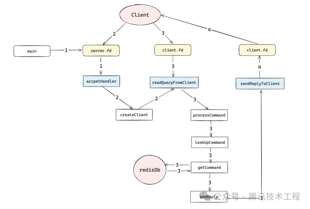 复制int main(int argc, char **argv) { initServerConfig(); // 初始化配置 // 8-lines 从文件中读取配置 initServer(); // 初始化服务 if (server.daemonize) daemonize(); // TODO redisLog(REDIS_NOTICE,"Server started, Redis version " REDIS_VERSION); // 5-lines,内存检查,加载rdb if (aeCreateFileEvent(server.el, server.fd, AE_READABLE, acceptHandler, NULL, NULL) == AE_ERR) oom("creating file event"); // 创建一个读的文件事件,处理者是acceptHandler redisLog(REDIS_NOTICE,"The server is now ready to accept connections on port %d", server.port); aeMain(server.el); // 启动redis主循环 aeDeleteEventLoop(server.el); // 循环推出清理资源 return 0; }1.2.3.4.5.6.7.8.9.10.11.12.13.14.(2) 过程2(客户端与服务端建立链接)