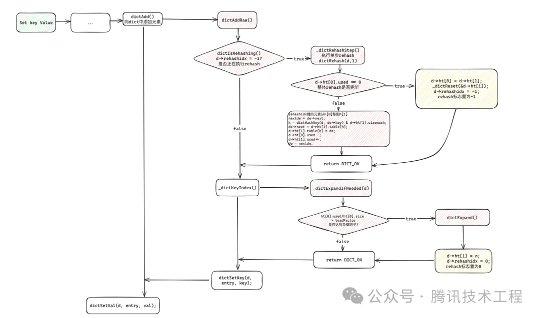 在有添加key的操作中,会调用dictAddRaw()函数,这里会根据rehashidx== -1看看是不是在rehash中,如果是则进行单步rehash;另外再尝试获取一个entry的index时,redis会看看当前ht[0]表是不是该扩容了,如果是则分配ht[1]的资源并将rehashidx置为0,开始reshsh;当ht[0].used变为0时,则认为rehash完成了,这时候将h[1]作为主表,释放之前h[0]的资源