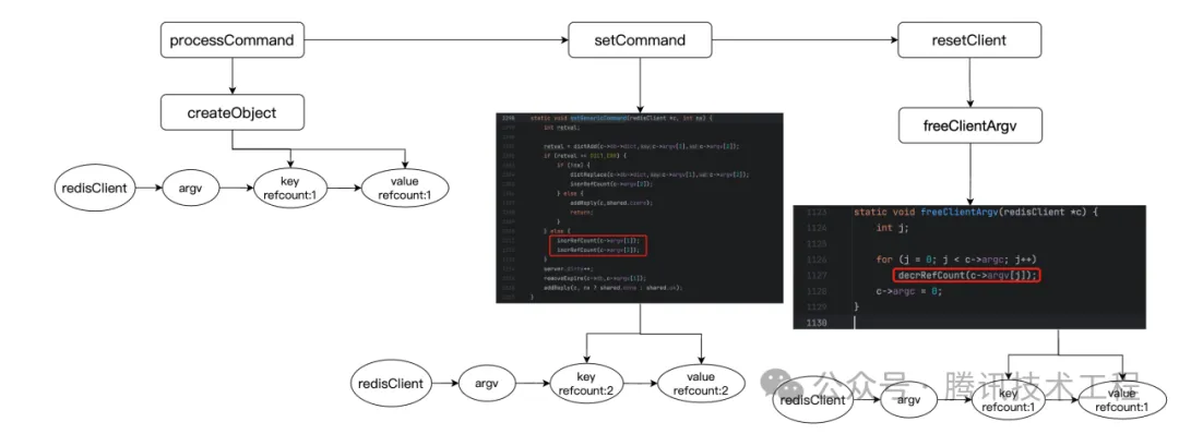 命令处理时,createObject()得到keyObj valueObj,refcount都为1执行setCommand的时候,调用了incrRefCount()方法,两者refCount都变为2在processCommand调用结束的时候,执行resetClient清理资源为下条做准备时,执行了decrRefCount,两者又都变为1,此时,key val的引用计数为1,即在dict中存在的一个引用