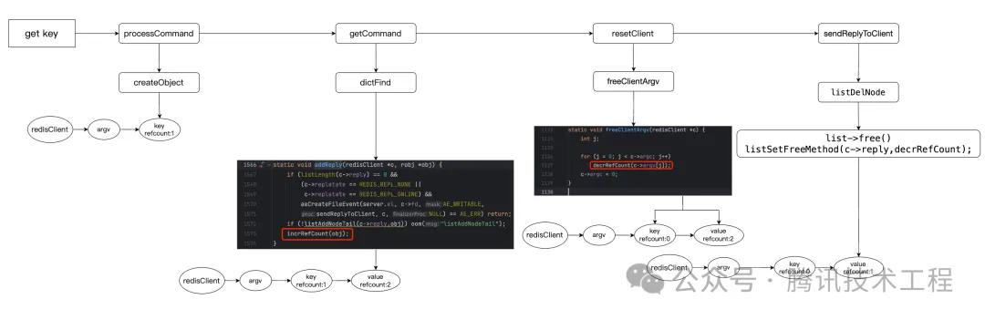 命令处理时,createObject()得到keyObj valueObj,key refcount为1然后调用getCommand后,再调用dictFind,在找到后addreply的时候调用了incrRefCount(),value的refcount此时从1变为2在命令执行完毕的时候,会重置客户端,执行了decrRefCount,此时key的refcount变为0,被清除掉在reply元素传输完毕删除的时候调用listDelNode删除元素,然后会调用list->free函数,free函数实际上是decrRefCount,这是value的refcount由2变为1。