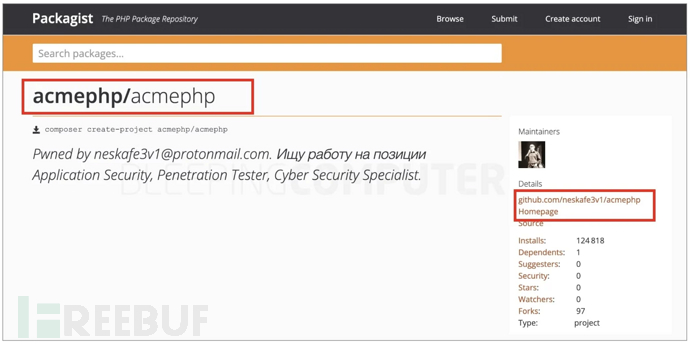 例如,下面截图中 acmepp 包 Packagist 页面的 GitHub 链接,已经从 GitHub.com/acmehp/acmephp 改为研究人员的 repo。