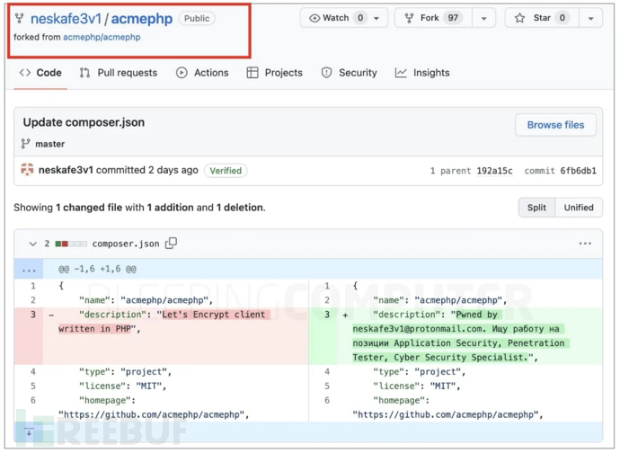 网络攻击者通过分叉原始项目存储库,修改 composer.json 中 的“description”字段,并将更改提交到自身的分叉存储库中,但没有将更改合并回原始存储库。(这样做需要额外的访问权限,并且可能会引起维护人员的仔细检查)。当 Bleeping Computer 要求网络攻击者分享劫持包裹使用的确切技术时,没有获得答案,反而收到了”我正在找工作,在被某家公司聘用后会披露一份报告,高防服务器没有获得取工作之前,没有什么可谈的。”一段话。
