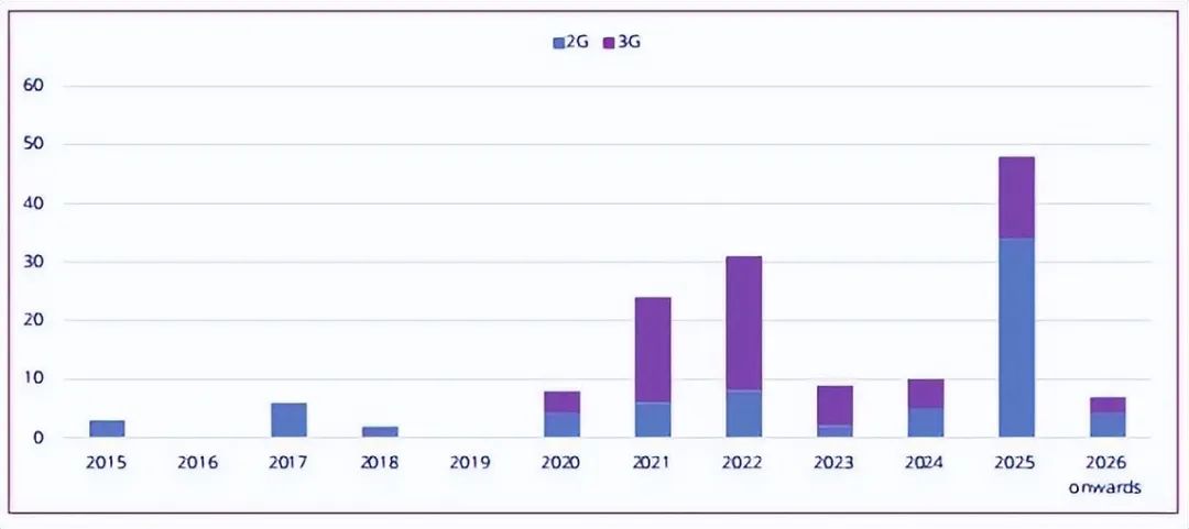 GSA的蜂窝研究表明,2G/3G的物联网规关网率将继续增加,尤其是模大卖流3G的关网速度将超过2G。2G/3G的收益关网潮将在2025年达到高峰。