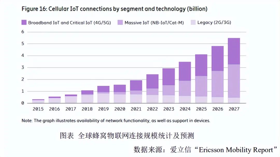全球蜂窝物联网连接规模统计及预测(来源:爱立信)