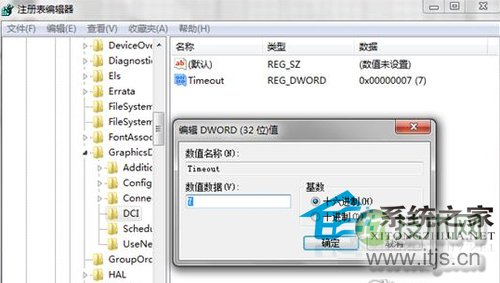 4在Windows 7下,运行注册表编辑器,依次定位到HKEY_LOCAL_MACHINESYSTEMCurrentControlSetControlGraphicsDriversDCI,然后在右侧窗口中找到并双击“Timeout”,接着,在弹出的窗口中将默认值“7”修改为“0”。