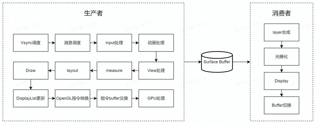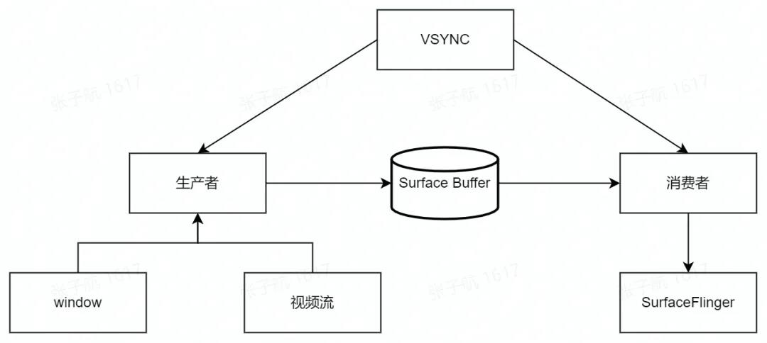 我们再回到 Vsync 的话题,消费 Vsync 的双方分别是 App 和 sf,其中 App 代表的是生产者,sf 代表的是消费者,两者交付的中间产物则是 surface buffer。