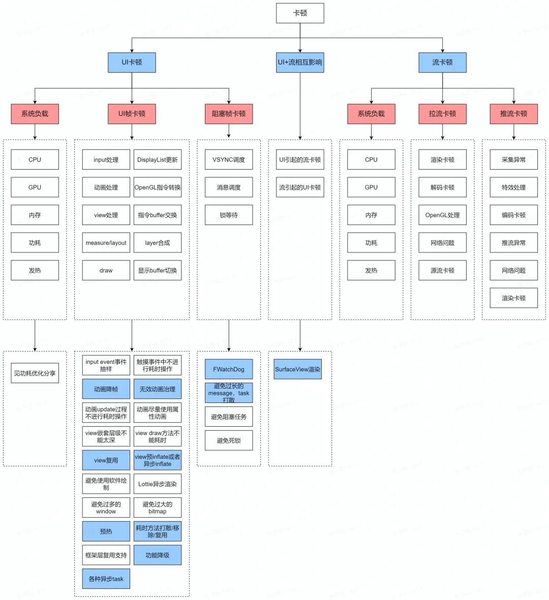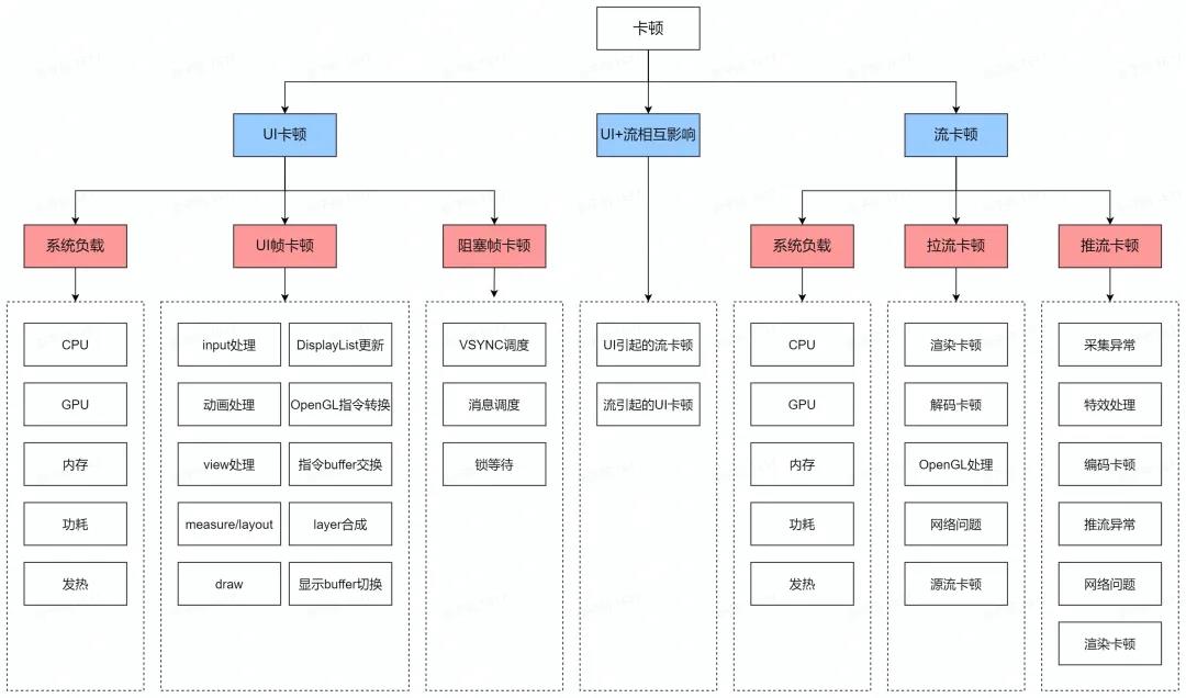 渲染卡顿:主要是 TextureView 渲染,textureview 跟随 window 共用一个 surface,每一帧均需要一起协同渲染并相互影响,UI 卡顿会造成视频流卡顿,视频流的卡顿有时候也会造成 UI 的卡顿;解码:解码主要是将数据流解码为 surface 可消费的 buffer 数据,是除了网络外最重要的耗时点。现在我们一般都会采用硬解,比软解的性能高很多。但是帧的复杂度、编码算法的复杂度、分辨率等也会直接导致解码耗时被拉长;OpenGL 处理:有时会对解码完成的数据做二次处理,这个如果比较耗时会直接导致渲染卡顿;网络:这个就不再赘述了,包括 DNS 节点优选、cdn 服务、GOP 配置等;推流异常:这个属于数据源出了问题,这里暂时以用户侧的视角为主,暂不讨论。2.5.3 系统负载内存:内存的吃紧会直接导致 GC 的增加甚至 ANR,是造成卡顿的一个不可忽视的因素;CPU:CPU 对卡顿的影响主要在于线程调度慢、任务执行的慢和资源竞争,比如降频会直接导致应用卡顿;GPU:GPU 的影响见渲染流程,但是其实还会间接影响到功耗和发热;功耗/发热:功耗和发热一般是不分家的,高功耗会引起高发热,进而会引起系统保护,比如降频、热缓解等,间接的导致卡顿。2.6 卡顿的分类我们此处再整体整理并归类,为了更完备一些,这里将推流也放了上来。在一定程度上,我们遇到的所有卡顿问题,均能在这里找到理论依据,这也是指导我们优化卡顿问题的理论支撑。