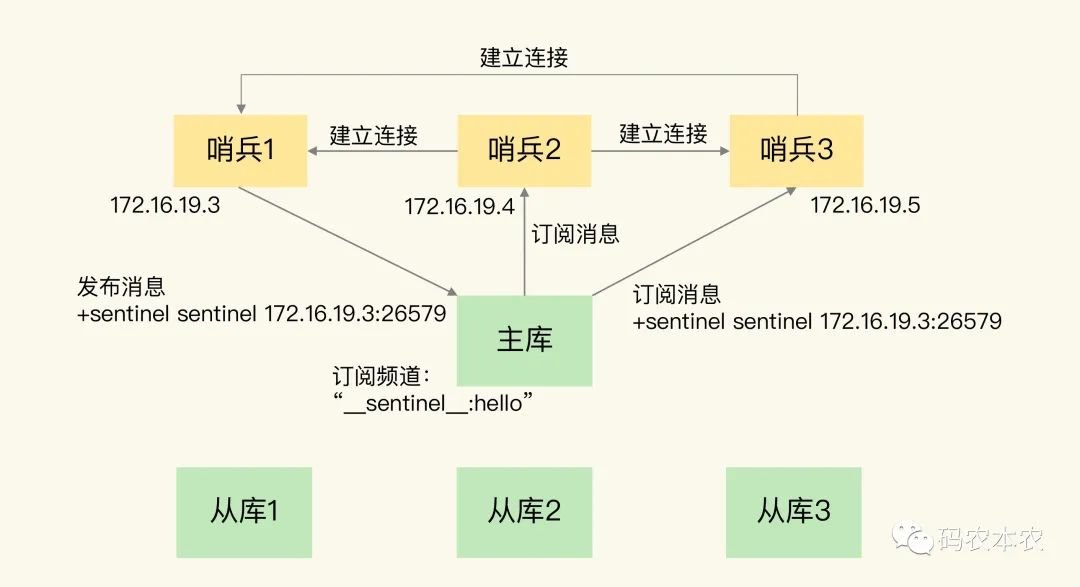 哨兵只要和主库建立起了连接,就可以在主库上发布消息了,比如说发布它自己的连接信息(IP 和端口)。同时,它也可以从主库上订阅消息,获得其他哨兵发布的连接信息。当多个哨兵实例都在主库上做了发布和订阅操作后,它们之间就能知道彼此的 IP 地址和端口。