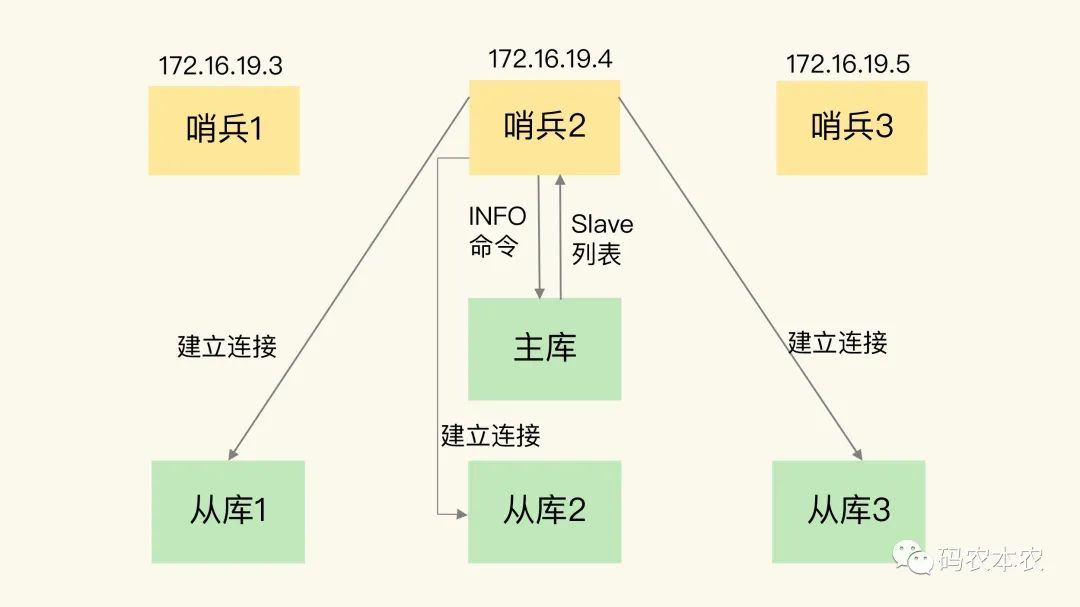 哨兵除了彼此之间建立起连接形成集群外,还需要和从库建立连接。这是因为,在哨兵的监控任务中,它需要对主从库都进行心跳判断,而且在主从库切换完成后,它还需要通知从库,让它们和新主库进行同步。