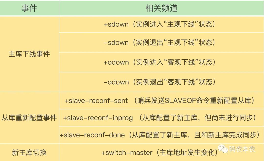 考虑到频道众多,尝试同时理解它们可能会让人感到不知所措。为了帮助你更轻松地理解,我将汇总一些关键频道,这些频道涵盖了几个重要事件,包括主库下线判断、新主库的选定和从库的重新配置。