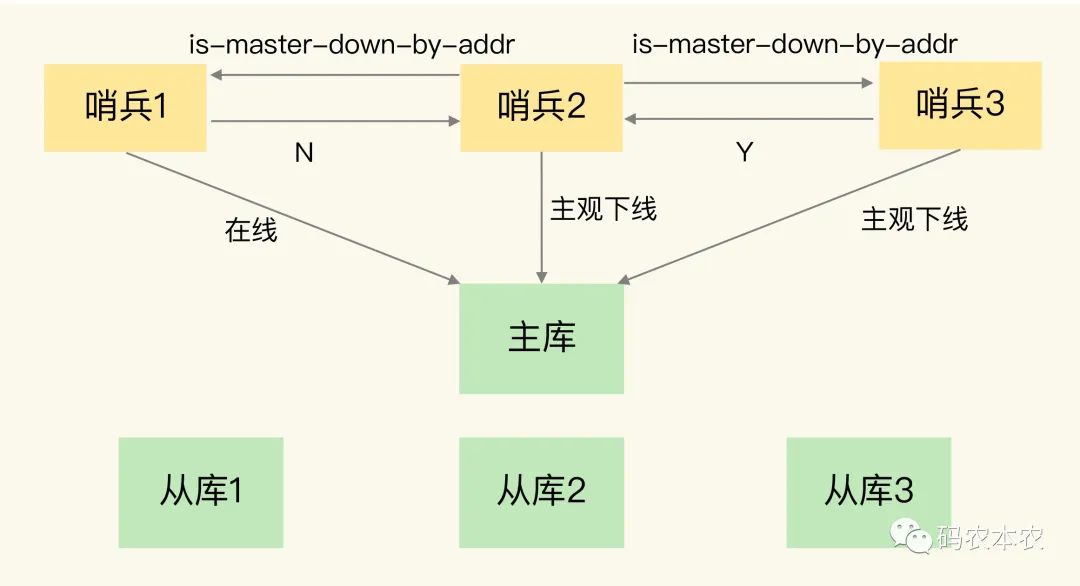 一旦一个哨兵实例认为主库“主观下线”,它会向其他哨兵实例发送 is-master-down-by-addr 命令。其他实例根据它们自身与主库的连接情况,给出 Y 或 N 的响应。在这里,Y 代表赞成,N 代表反对。
