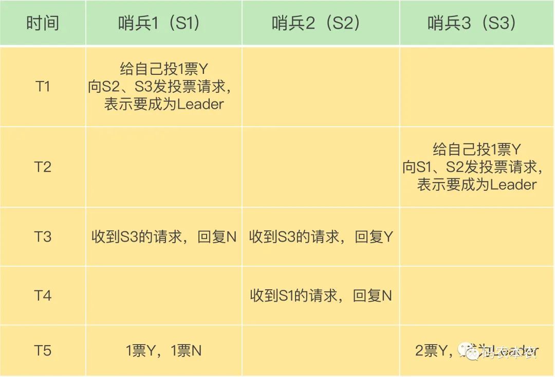 这么说你可能还不太好理解,我再画一张图片,展示一下 3 个哨兵、quorum 为 2 的选举过程。
