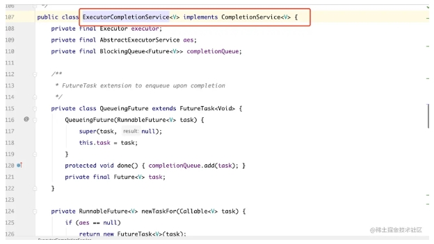 QueueingFuture 继承自 FutureTask,而且红线部分标注的位置,重写了 done() 方法。把 task 放到 completionQueue 队列里面,当任务执行完成后,task 就会被放到队列里面去了。此时此刻 completionQueue 队列里面的 task 都是已经 done() 完成了的 task,而这个 task 就是我们拿到的一个个的 future 结果。如果调用 completionQueue 的 task 方法,会阻塞等待任务。等到的一定是完成了的 future,我们调用 .get() 方法就能立马获得结果。