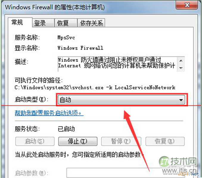 4、在属性窗口中,点击“启动”,并且将启动设置为自动启动。
