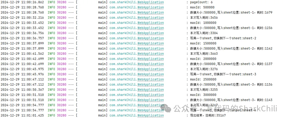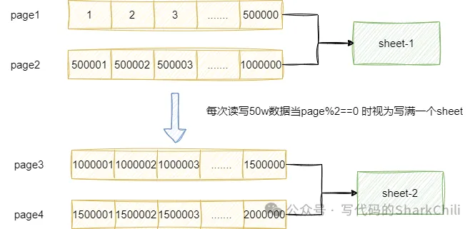 复制long start = System.currentTimeMillis(); UserMapper userMapper = SpringUtil.getBean(UserMapper.class); //计算总的数据量 int count = Math.toIntExact(userMapper.selectCount(Wrappers.emptyWrapper())); //获取分页总数 int queryCount = 50_0000; int pageCount = count % queryCount == 0 ? count / queryCount : count / queryCount + 1; log.info("pageCount: {}", pageCount); //设置导出的文件名 String fileName = "F://tmp/result.xlsx"; //设置excel的sheet号码 int sheetNo = 1; //设置第一个sheet的名字 String sheetName = "sheet-" + sheetNo; // 创建writeSheet WriteSheet writeSheet = EasyExcel.writerSheet(sheetNo, sheetName).build(); //记录每次分页查询的最大值 Long maxId = null; //指定文件 try (ExcelWriter excelWriter = EasyExcel.write(fileName, User.class).build()) { //写入每一页分页查询的数据 for (int i = 1; i <= pageCount; i++) { // 分页去数据库查询数据 这里可以去数据库查询每一页的数据 long queryStart = System.currentTimeMillis(); List<User> userList = null; //如果是第一次则直接进行分页查询,反之基于上一次分页查询的分页定位实际偏移量,筛选前n条数据以达到分页效果 PageHelper.startPage(1, queryCount, false); if (i == 1) { userList = userMapper.selectList(Wrappers.emptyWrapper()); } elseif (maxId != null) { QueryWrapper wrapper = new QueryWrapper(); wrapper.gt("id", maxId);//相当于where id=1 userList = userMapper.selectList(wrapper); PageHelper.startPage(0, queryCount, false); } //更新下一次分页查询用的id if (CollUtil.isNotEmpty(userList)) { maxId = userList.get(userList.size() - 1).getId(); log.info("maxId: {}", maxId);} long queryEnd = System.currentTimeMillis(); log.info("数据大小:{},写入sheet位置:{},耗时:{}", userList.size(), sheetName, queryEnd - queryStart); long writeStart = System.currentTimeMillis(); excelWriter.write(userList, writeSheet); long writeEnd = System.currentTimeMillis(); log.info("本次写入耗时:{}", writeEnd - writeStart); //如果% 2 == 0,则说明一个sheet写入了50*2即100w的数据,需要创建新的sheet进行写入 if (i % 2 == 0) { sheetName = "sheet-" + (++sheetNo); writeSheet = EasyExcel.writerSheet(sheetNo, sheetName).build(); log.info("写满一个sheet,切换到下一个sheet:{}", sheetName);} } } long total = System.currentTimeMillis() - start; log.info("导出结束,总耗时:{}", total);1.2.3.4.5.6.7.8.9.10.11.12.13.14.15.16.17.18.19.20.21.22.23.24.25.26.27.28.29.30.31.32.33.34.35.36.37.38.39.40.41.42.43.44.45.46.47.48.49.50.51.52.53.54.55.56.57.58.59.60.61.62.63.64.65.66.67.68.69.70.71.可能会有读者好奇笔者这个50w的数值设计思路是什么,除了考虑避免OOM以外,还考虑到每个sheet只能写入100w条的数据,为了方便通过分页查询的轮次确定当前写入的数据量大小,笔者尝试过20w、50w。 最终在压测结果上看出,50w读写耗时虽然是20w的2倍,但是IO次数却不到20w查询的二分之一,通过更少的IO操作获得更好的执行性能。