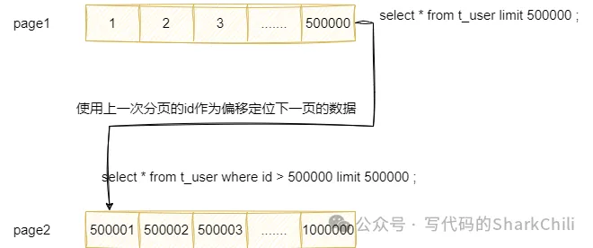 复制id|select_type|table |partitions|type|possible_keys|key|key_len|ref|rows |filtered|Extra| --+-----------+------+----------+----+-------------+---+-------+---+-------+--------+-----+ 1|SIMPLE |t_user| |ALL | | | | |2993040| 100.0| |1.2.3.因为我们的数据表是id自增的,所以我们查询的时候完全可以基于该特性通过上一次查询到的id作为筛选条件进行分页查询。